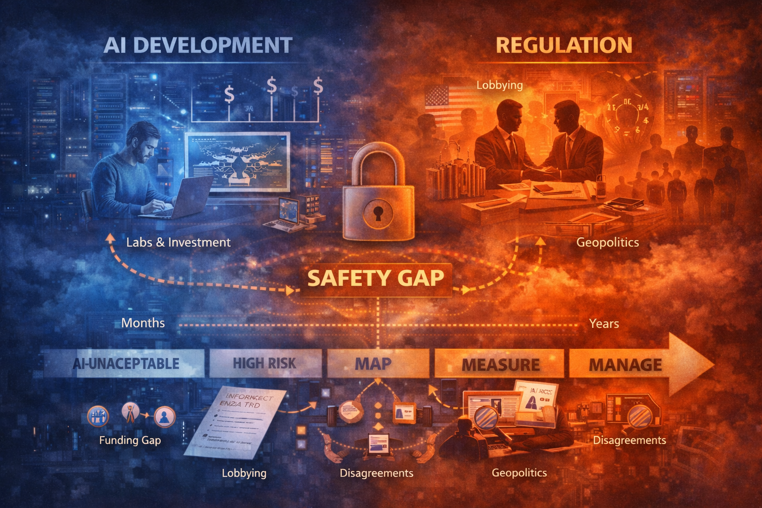 AI safety is not just a technical problem, it is political and economic. Large firms lobby to delay regulation. Capability research receives orders of magnitude more funding than safety research. Development cycles run in months; regulation takes years. Meanwhile, geopolitical competition punishes restraint.